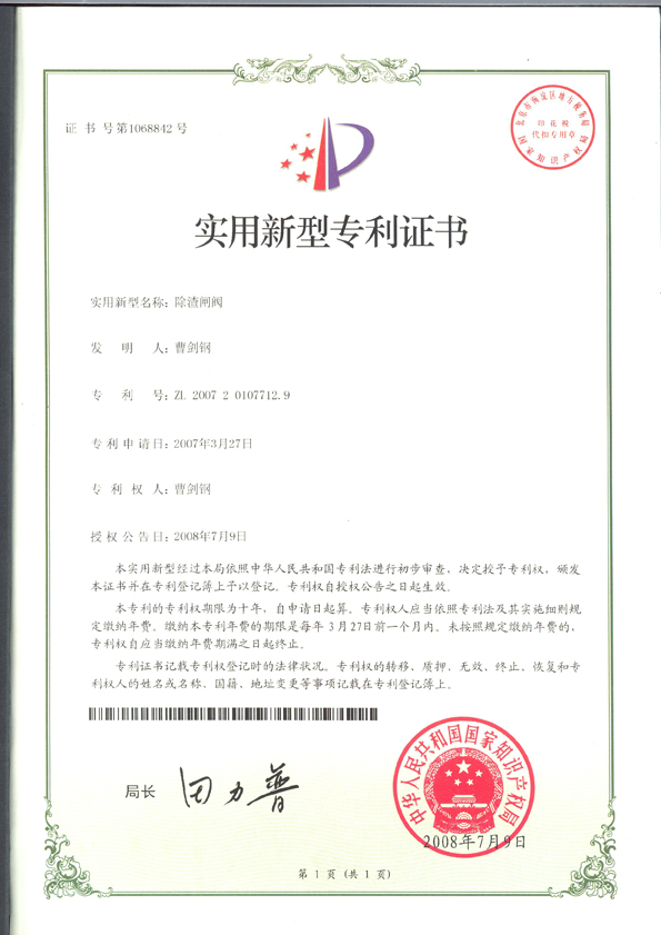 除渣閘閥--實(shí)用新型專(zhuān)利證書(shū)